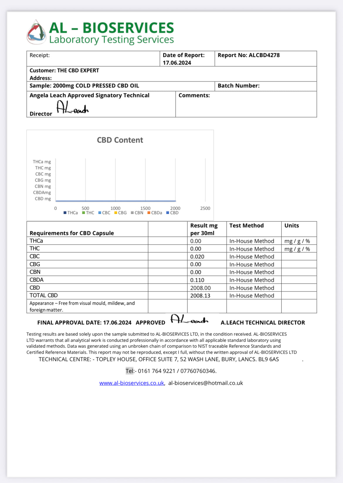 Experience the power of full-spectrum CBD with The CBD Expert 2000mg Cold-Pressed CBD Oil. This premium-grade formulation is extracted using a cold-press method, ensuring that all the natural cannabinoids, terpenes, and essential hemp compounds remain intact for maximum potency and effectiveness.